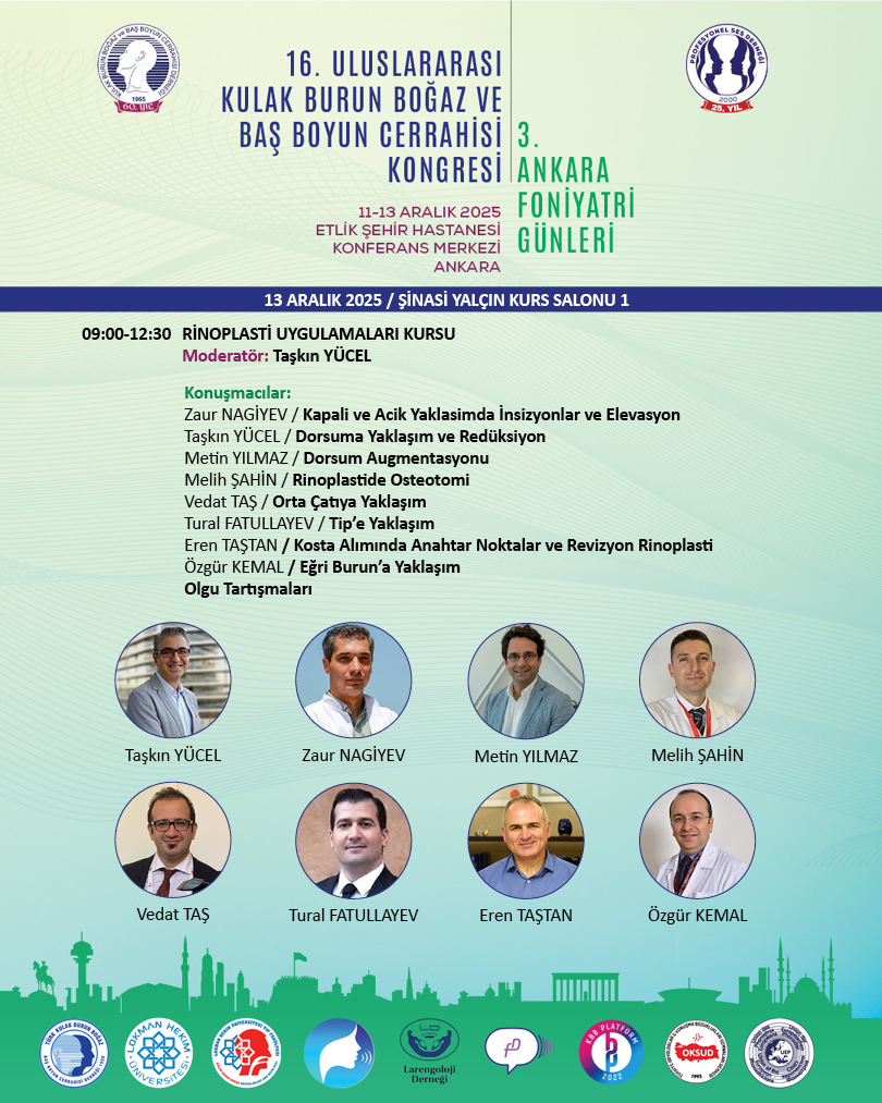 13 Aralık Cumartesi sabahı düzenlenecek olan “Rinoplasti Uygulamaları Kursu” ile; güncel yaklaşım ve tekniklerin aktarılacağı, bilgi-tecrübe paylaşımının yapılacağı verimli bir bilimsel ortam sunuyoruz.