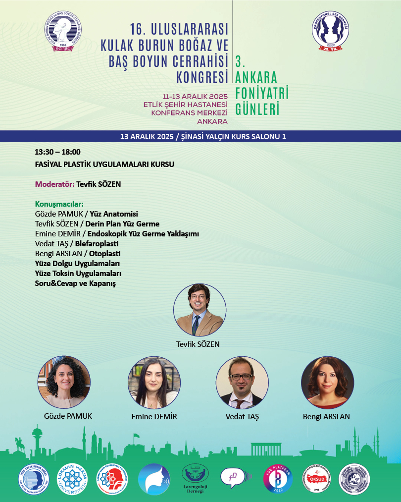 16. Uluslararası KBB ve Baş Boyun Cerrahisi Kongresi kapsamında düzenlenen Fasiyal Plastik Uygulamaları Kursu, 13 Aralık 2025 tarihinde Şinasi Yalçın Kurs Salonu 1’de gerçekleştirilecektir.