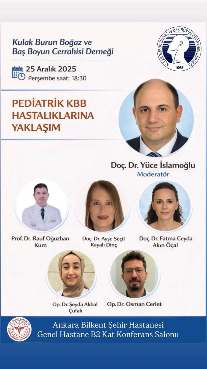 Kulak Burun Boğaz ve Baş Boyun Cerrahisi Derneği’nin 3. bilimsel toplantısı, 25 Aralık 2025 Perşembe günü saat 18:30’da gerçekleştirilecektir.