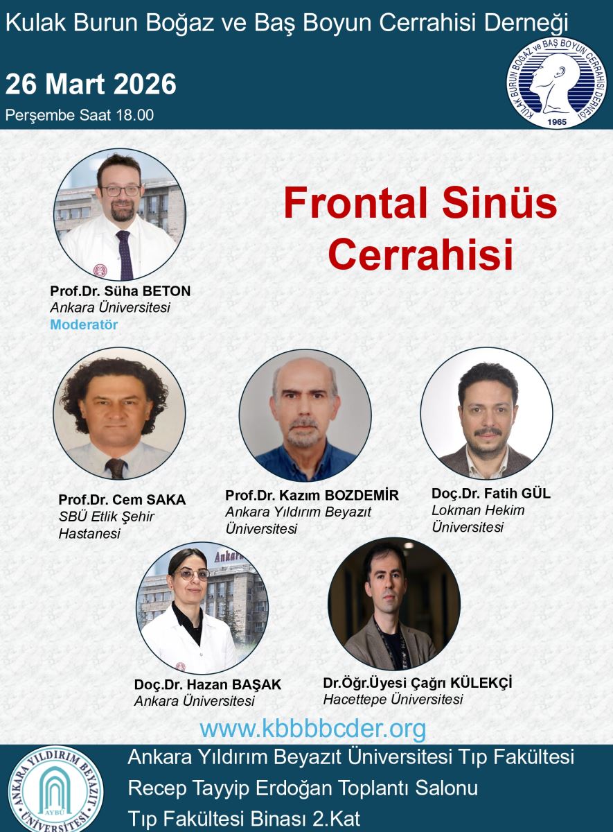 Kulak Burun Boğaz ve Baş Boyun Cerrahisi Derneği tarafından düzenlenen eğitim toplantıları kapsamında gerçekleştirilecek olan 6. Eğitim Toplantısı, “Frontal Sinüs Cerrahisi” başlığı ile 26 Mart 2026 Perşembe günü saat 18.00’de Ankara Yıldırım Beyazıt Üniversitesi Tıp Fakültesi Recep Tayyip Erdoğan Toplantı Salonu’nda düzenlenecektir.